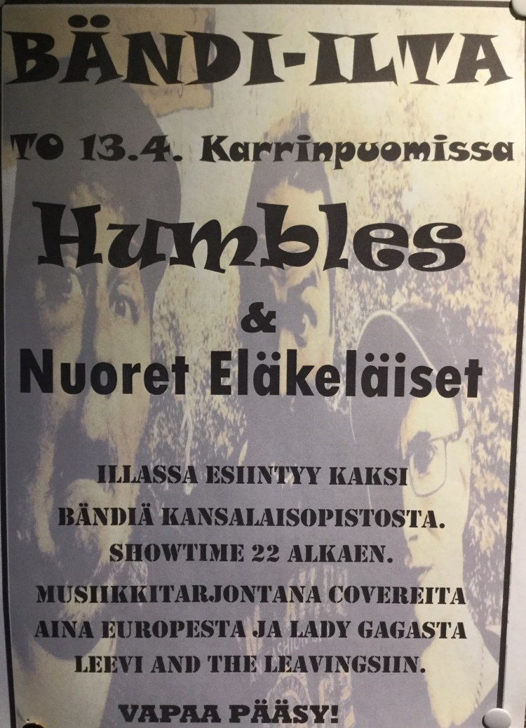 To 13.4. BÄNDI-ILTA Kirjoittanutkarrinpuomi3.4.2017Kategoria(t):Yleinen Illassa esiintyy Humbles sekä Nuoret Eläkeläiset. Vapaa pääsy! Jaa: Jaa X:ssä(Avautuu uudessa ikkunassa) X Jaa Facebookissa(Avautuu uudessa ikkunassa) Facebook Tykkää Lataa...