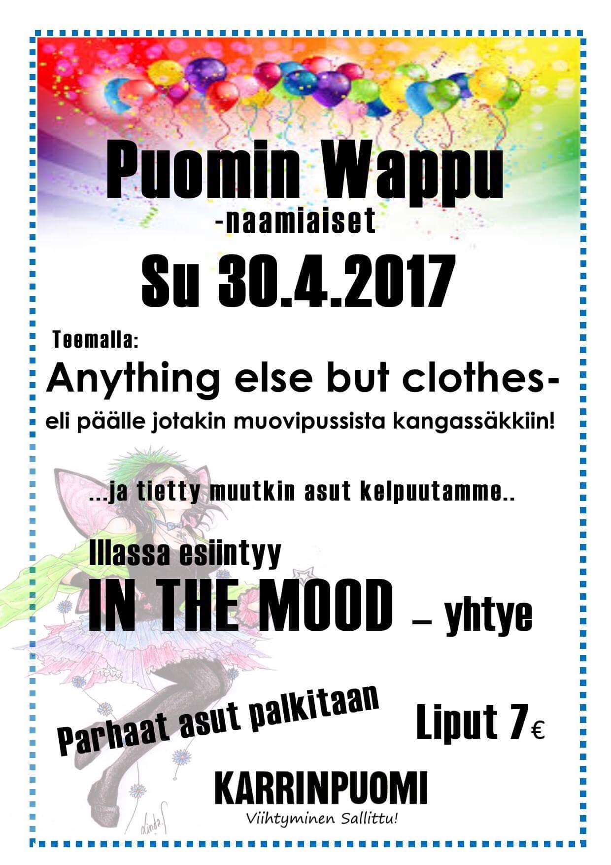 #Wappunaamiaiset Kirjoittanutkarrinpuomi23.4.2017Kategoria(t):Yleinen Wappuna päälle jotakin sellaista, mikä peittää strategiset paikat ja paikalliseen. Musiikista vastaa IN THE MOOD. Liput 7€. Tervetuloa! Jaa: Click to share on X(Avautuu uudessa ikkunassa) X Jaa Facebookissa(Avautuu uudessa ikkunassa) Facebook Tykkää Lataa...